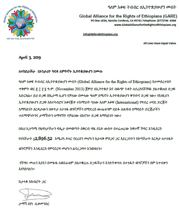 በለንደን ኦንታሪዮ የኢትዮጵያ ማሕበር፣ በጌድዮና በጎንደር ሕዝባችን ላይ የደርሰውን የመፈናቀል አሰቃቂ ችግር ለመታደግ በማርች 31 ቀን፣ 2019 ዓ/ም ባደረገው አስቸኳይ የርዳታ ጥሪ፣ ግማሽ ሰዓት ባልሞላ ጊዜ ውስጥ $860 የካናዳ ዶላር ለማሰባሰብ ችሏል። ማሕበሩ፣ ከዚህ በፊት ዶክተር አቢይን ለመደገፍና በሰኔ 16ቱ የቦንብ ጥቃት ለደረሰባችው ወገኖቻችን የተሰበሰበውን መዋጮ በመጨመር፣ በጠቅላላው $2896.52 የሜሪካን ብር ($4,000 የካናዳ ብር)፣ ታማኝ በየነ በሚመራው ግሎባል አልያንስ በኩል አፕሪል 3፣ 2019 ዓ/ም ተልኳል። (ከታች ያለውን ደረሰኝ ይመልከቱ).